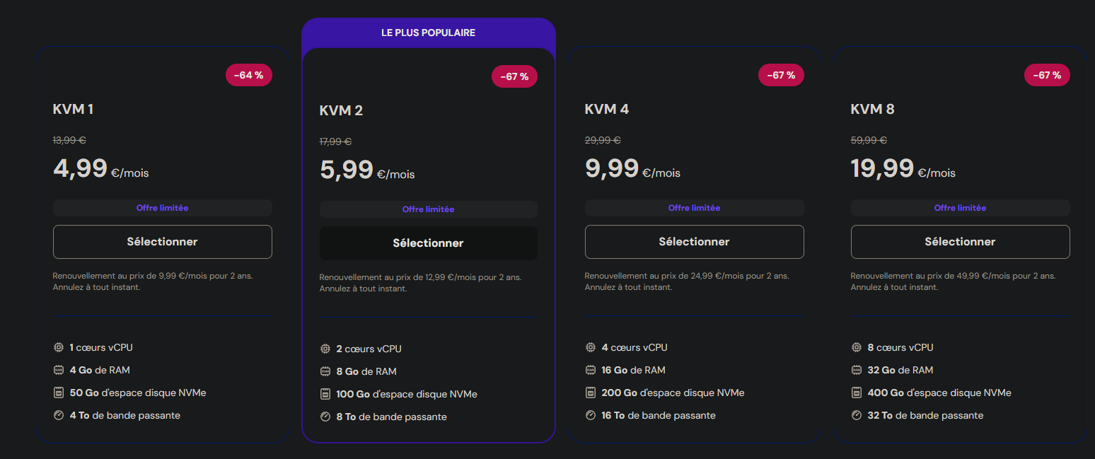 Pour la plupart des utilisateurs français, le plan KVM 2 (2 vCPU, 8 Go RAM, 100 Go NVMe) offre le meilleur équilibre entre puissance et prix.Si vous débutez ou avez un site plus modeste, le plan KVM 1 (1 vCPU, 4 Go RAM, 50 Go NVMe) suffit amplement.